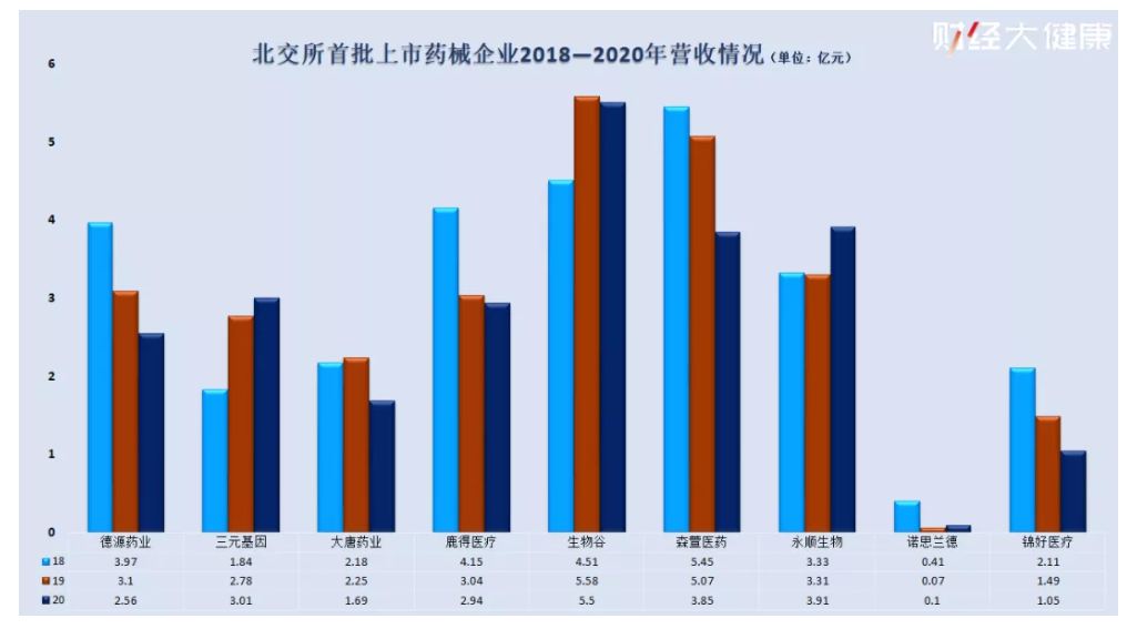 從北交所首批上市的這幾家藥械企業來看,年收入最大的不過5億元左右,最低的還不足1億元,凈利潤過億的只有森萱醫藥一家。