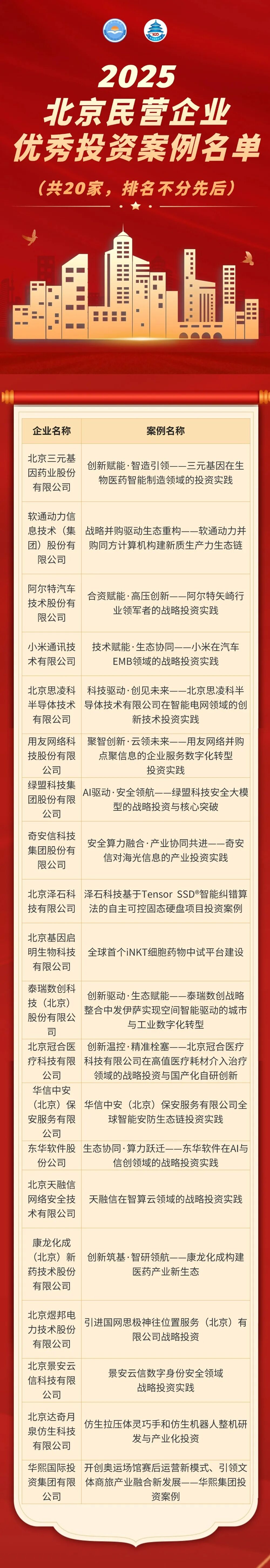 憑借在生物醫(yī)藥領域的投資布局與創(chuàng)新成果,"三元基因在生物醫(yī)藥智能制造領域的投資實踐"案例成功斬獲"2025 北京民營企業(yè)優(yōu)秀投資案例"殊榮。此次優(yōu)秀投資案例評選與百強榜單發(fā)布同屬北京市工商業(yè)聯(lián)合會組織的民營經(jīng)濟發(fā)展成果展示系列活動,旨在發(fā)掘民營企業(yè)投資創(chuàng)新典范,展現(xiàn)首都民營經(jīng)濟高質量發(fā)展活力,從商業(yè)價值、市場前景、商業(yè)模式、技術創(chuàng)新性、團隊情況、社會效益、投后管理和案例質量8個維度構建評價體系,鼓勵民營企業(yè)梳理投資領域的成功實踐,展示其通過投資布局推動技術創(chuàng)新、產(chǎn)業(yè)升級、經(jīng)濟增長和社會發(fā)展的成果。本次評選經(jīng)資格審核、專家評審、社會公示等多輪環(huán)節(jié)后,最終遴選出20個優(yōu)秀投資案例。三元基因的入選既是對其投資戰(zhàn)略前瞻性的高度認可,也為生物醫(yī)藥行業(yè)投資發(fā)展提供了實踐標桿。