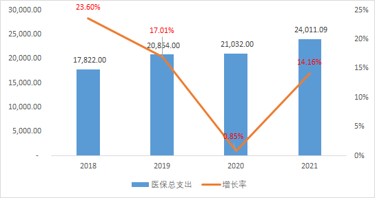 總體來看,近5年參保人數呈緩慢增態勢。醫保基金收入穩步增長,近4年復合增長率達10%;同期醫保控費取得良好效果,特別是從2020年開始,醫保支出的增速開始小于醫保收入的增速;2021年醫保基金累計結存創新高達3.6萬億元,近4年復合增長率達15%。