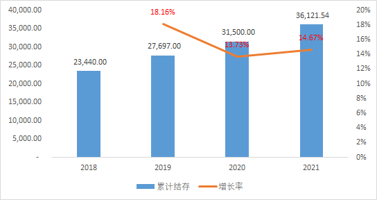 醫保累計結存增速較快,近4年年復合增長率達15.51%。截至2021年末,醫保累計結存36121.54億元。