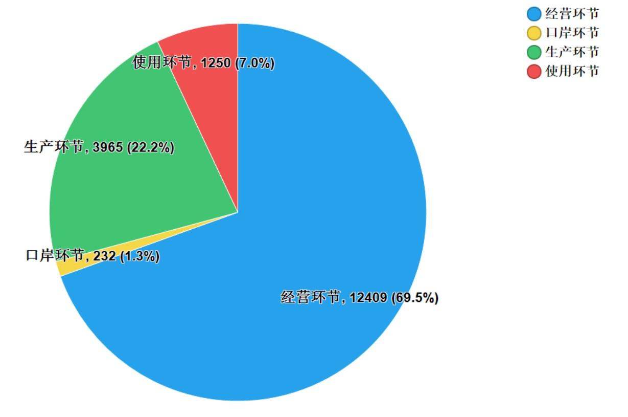 2021年國家藥品抽檢共抽檢化學藥品81個品種9455批次,涉及生產環節1769批次、經營環節6577批次、使用環節877批次、口岸環節232批次。經檢驗,不符合規定18批次,在生產、經營、使用、口岸環節分別檢出不符合規定產品2批次、16批次、0批次和0批次,分別占對應環節全部樣品的0.1%、0.2%、0.0%、0.0%(見圖4)。