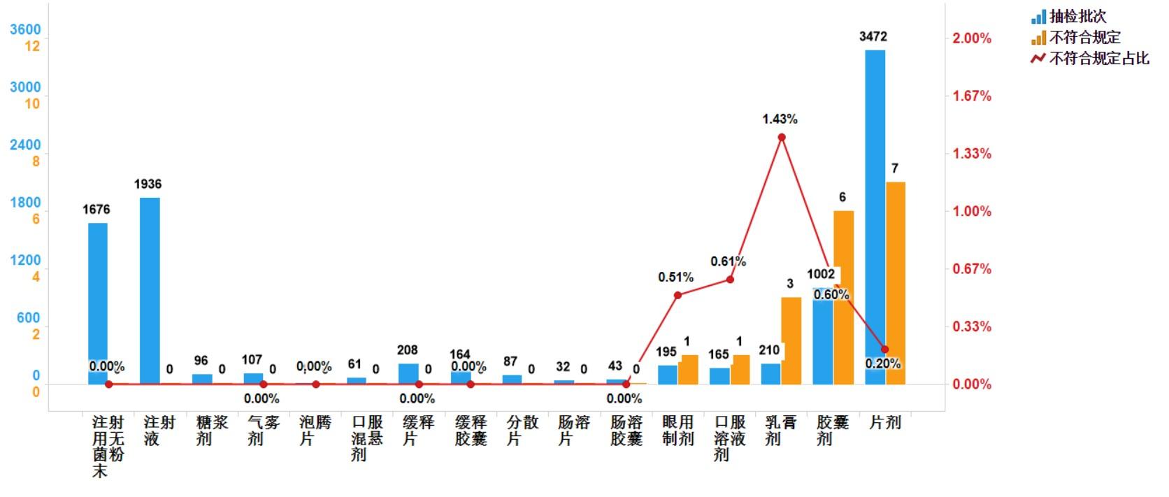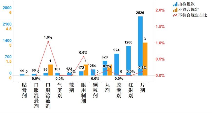 2021年國家藥品抽檢共抽檢制劑產品15899批次。經檢驗,15861批次產品符合規定,38批次產品不符合規定。抽檢的130個品種中,全部樣品符合規定的制劑產品有108個,共12419批次。其中,化學藥品有70個品種7674批次,中成藥有35個品種4681批次,生物制品有3個品種64批次。