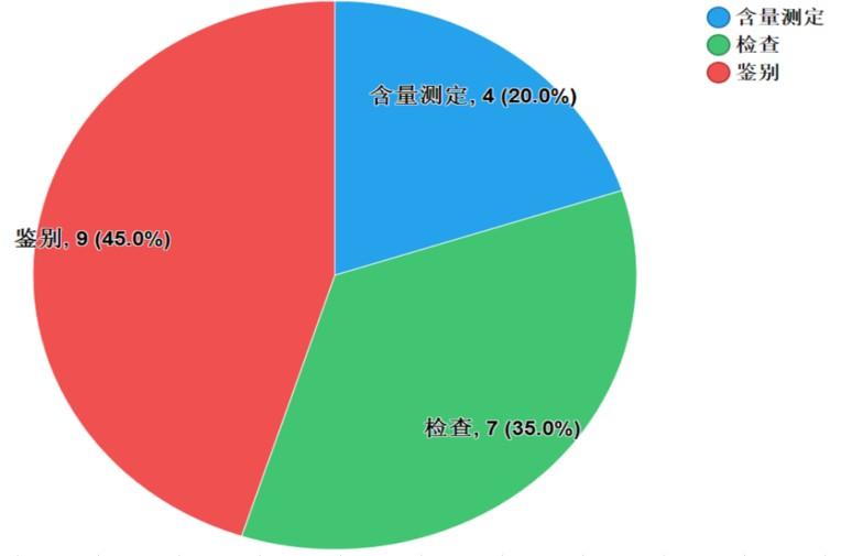 不符合規定項目主要涉及鑒別、檢查、含量測定等,不符合規定樣品批次依次為9批次、7批次和4批次,分別占全部不符合規定項目的45.0%、35.0%和20.0%(見圖8)。