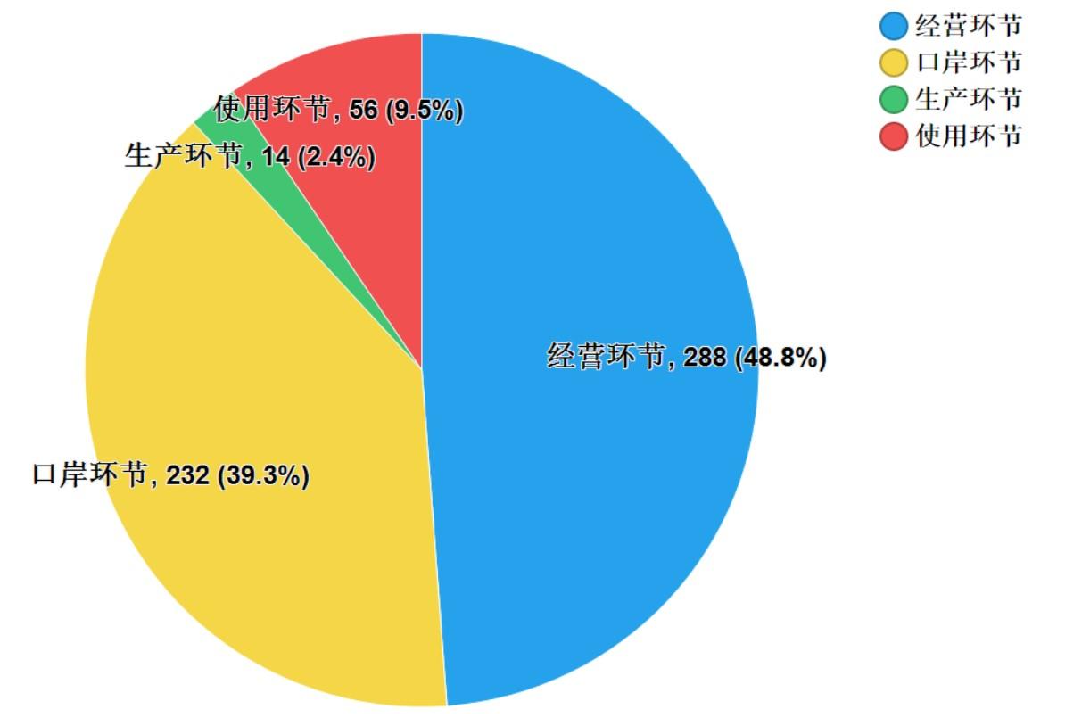 2021年,國家藥品抽檢共抽檢進口藥品590批次,涉及4個劑型(見圖13),其中口岸環節232批次、生產環節14批次、經營環節288批次、使用環節56批次(見圖14)。經檢驗,所檢項目均符合規定,合格率為100%。