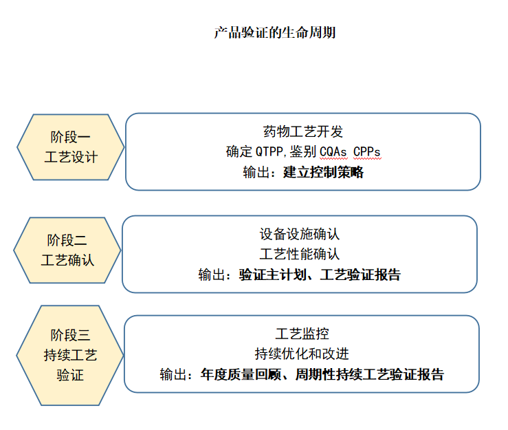 從產(chǎn)品驗(yàn)證的生命周期來(lái)講,可以分為三個(gè)階段,工藝設(shè)計(jì)、工藝確認(rèn)、持續(xù)工藝驗(yàn)證,如下圖所示。
