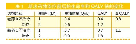 效果可用延長生命年(life year gains,LY),或者經過生活質量和藥物產生副作用調整后獲得的效用值相乘獲得的生命質量調整生命年(QALY)表示,最后計算出每延長一個生命質量調整年的成本(cost per QALY)。