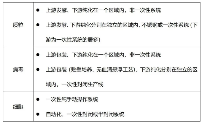質(zhì)粒、病毒載體和細(xì)胞制劑均可視作非最終滅菌制劑,一般可進行共線生產(chǎn)的品種,在生產(chǎn)工藝上的差別也較小。比如細(xì)胞制劑一次性純手動生產(chǎn)工藝和自動化全封閉工藝則相對較難實現(xiàn)共線生產(chǎn)。一方面,生產(chǎn)設(shè)備大,手動生產(chǎn)主要生產(chǎn)設(shè)備為生物安全柜、二氧化碳培養(yǎng)箱、離心機等,自動化封閉生產(chǎn)工藝主要生產(chǎn)設(shè)備為Sepax C-Pro、Xuri(WAVE)等。此外,生產(chǎn)環(huán)境潔凈度要求也有所不同,純手動生產(chǎn)需在B+A環(huán)境下,半封閉設(shè)備在C級環(huán)境下,全封閉設(shè)備則可在D級環(huán)境即可。