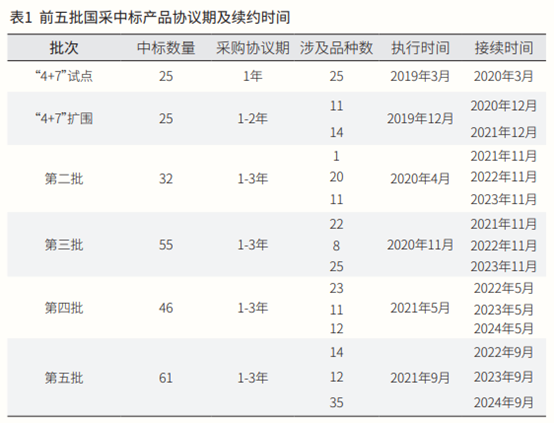 隨著國采滾動開展,面對不同批次中1年—3年的標期,各地每年面臨多批次產品接續。從2020年3月第一批“4+7”試點接續工作開始,各地各批次接續工作系統性開展,國采成果繼續延續。其中國采第一批、第三批協議期滿品種接續工作基本上已經完成,各地已陸續公布結果。國采第二批2年期品種、第四批1年期品種的續約工作在2022年上半年展開,各省進度不一,大多已發接續通知或已開始執行(見表1)。