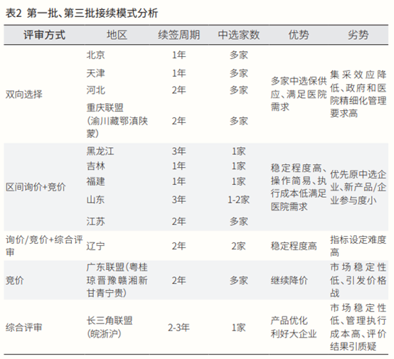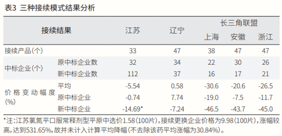 以江蘇(區間詢價+競價)、遼寧(詢價/競價+綜合評審)、長三角聯盟(綜合評審)這三種模式進行第一批、第三批接續結果的分析(見表3),具體情況如下。